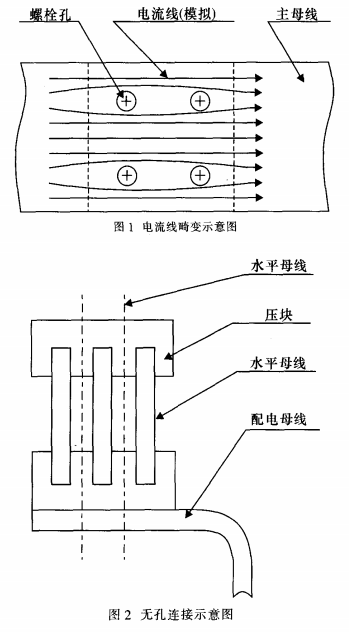 目前,低壓成套開關設備母線槽系統的連接主要是利用螺栓連接。螺栓連接在小電流、母線槽數量不多的情況下具有緊湊、可靠、方便等特點;而隨著用電設備的增加,開關柜的容量越來越大,用螺栓連接的缺點也日益顯露出來:由于需要在母線槽上鉆螺栓孔,造成母線槽截面不同,必然引起母線槽電流流線的畸變,如圖1所示。所以要求螺栓用孔盡可能的小以盡量減小對電流的影響,但是在配電房里進行拼柜的過程中不可避免的存在累積公差,開關柜的數量越多累積公差越大,往往造成配電母線槽和主母線槽的螺栓孔產生錯位。為了解決螺栓孔錯位問題,多數情況下是采取沖橢圓形孔或沖大孔。這就存在矛盾:螺栓孔開大了,嚴重影響母排載流量,螺栓孔開小了,安裝不方便。研究新的連接方法成了開關柜制造商的關注的焦點,無孔連接這種新技術逐漸成為設計人員研究的對象,并且取得一定的成功。目前已有多家廠家研究出形式各異的的無孔連接技術。筆者也于2001年開始對無孔連接技術進行研究,并設計出另一種與眾不同的無孔連接方式,經過產品試制和試驗,證明這種連接方法是行之有效的。