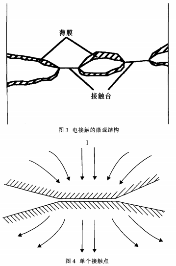 我們知道,在母線槽連接處的電阻,除了母線槽本身存在的電阻外,還存在一個接觸電阻。這是因為:不論母線槽表面處理得如何光滑平整,在微觀環境下,母線槽表面也是凹凸不平的,如圖3所示,兩片母線槽之間的搭接實際上只有母線槽表面上無數小尖峰之間的接觸,電流流過搭接面的實際面積減少了,電流線發生嚴重的收縮現象,產生收縮電阻R,取其中一點分析其結構如圖4所示。另一方面,母線槽從加工完畢到裝在開關柜里有一定的時間差,很容易因為暴露在空氣里而形成一層薄膜(如氧化膜等),使電阻增大,稱為膜電阻R,。所以接觸電阻實際上是由這兩部分組成,即