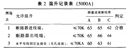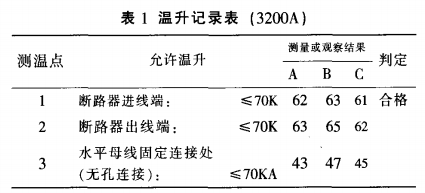 表2是本公司溫升試驗室的質檢人員按照國家標準GB7251.1-1997的有關條款對該樣柜進行溫升試驗,對整個母線槽系統的關鍵處和搭接面進行測量(測得部分溫升記錄)