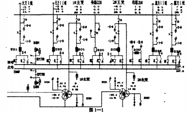 1.1一次主接線。圖1-1所示為220KV仿真綜合站的一次系統(tǒng)主接線圖,220KV仿真站內(nèi)有兩臺(tái)三相三繞組有載調(diào)壓變壓器,有三個(gè)電壓等級(jí)220KV、110KV、35KV,接線組別為YO/Y0/A,冷卻系統(tǒng)為強(qiáng)迫油循環(huán)風(fēng)冷系統(tǒng)。220KV系統(tǒng)為雙母帶旁母接線運(yùn)轉(zhuǎn),共有4回線路,有獨(dú)立的母聯(lián)斷路器和旁路斷路器。110KV系統(tǒng)為雙母帶旁母接線運(yùn)轉(zhuǎn),共有7條線路,有獨(dú)立的母聯(lián)斷路器和旁路斷路器。35KV系統(tǒng)為雙母帶旁母接線運(yùn)轉(zhuǎn),共有10條線路,有獨(dú)立的母聯(lián)斷路器和旁路斷路器。