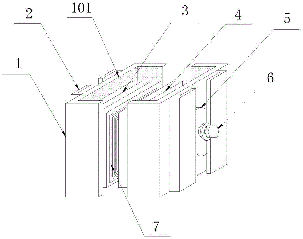 2.根據權利要求1所述的一種環氧樹脂澆注母線槽聯接器,其特征在于,所述鋼架(1)的內周圍面設置有絕緣層(101),所述絕緣層(101)的材料為環氧樹脂。